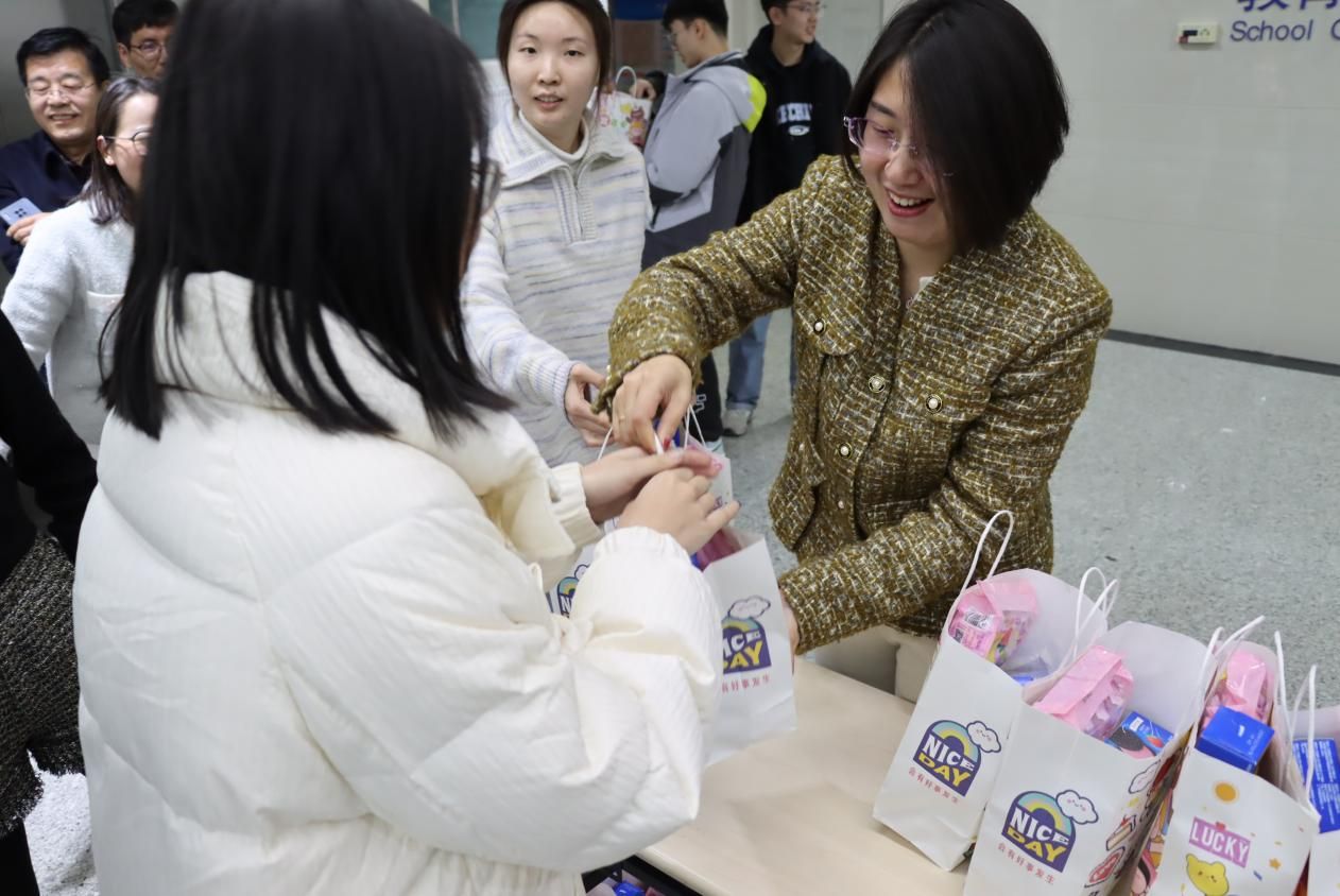 小小的考研礼包,寄托着学院对于考研学子的殷切期盼与关怀,礼包内不仅有心想事“橙”、一举夺魁的大橙子,也有牛气冲天、好事成双的牛奶,瑞兆临门的瑞士卷,更有寓意着奥援有灵,如有神助的奥利奥饼干。学院党委书记季竹君、副院长李开云代表学院向在场的考研学子送上最真挚的祝福,并对他们认真备考,努力学习、追求梦想的精神给予了高度的赞扬与充分的肯定,并祝愿每一个考研的同学都可以成功上岸,考上心仪的学校。他们嘱咐同学们要充分利用好最后的时间段,不松懈、不气馁,及时与学院反映所遇到的困难,学院会尽最大的努力解决好问题,守护好同学们考研的“最后一步”。考研学子纷纷表示,自己将不负学院的期盼与关怀,以良好的精神面貌迎接最后的冲刺。