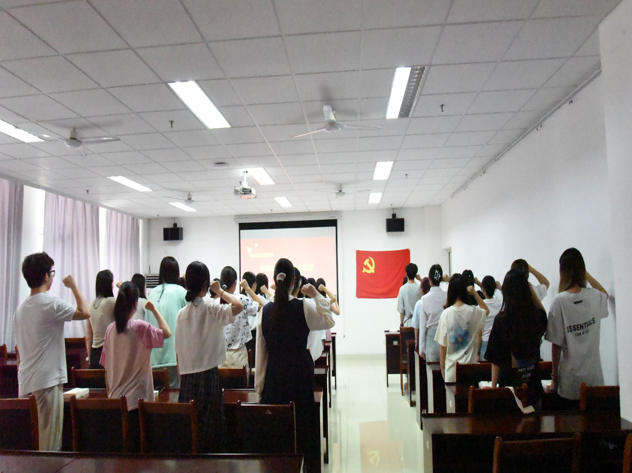 入党宣誓仪式在庄严的《国际歌》中正式开始,学生支部书记卓华丽宣读了《2025年上半年新发展预备党员名单》。学生党支部书记曹丽丽引领全体新党员高举右拳,面向党旗庄严宣誓。誓言铿锵有力,彰显了全体党员对党的赤诚忠心与投身共产主义事业的坚定信念。
