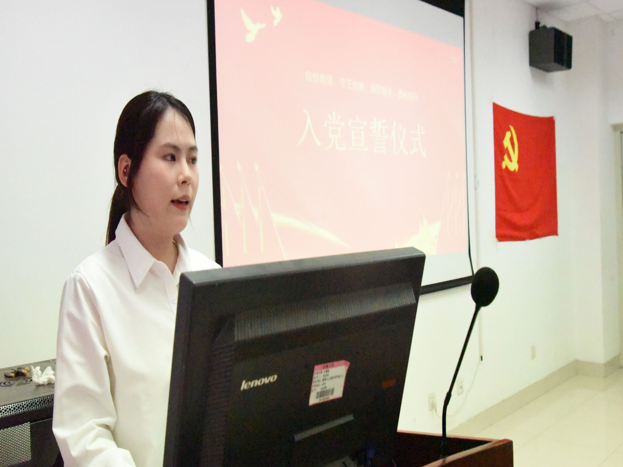 随后,预备党员代表田欣冉发言,回顾了自己入党的历程和体会,表达了对党组织的憧憬和入党的决心,她代表全体预备党员郑重承诺:将始终牢记党员身份,践行党的宗旨,在学习生活中发挥先锋模范作用,以实际行动争取早日成为一名合格的共产党员。