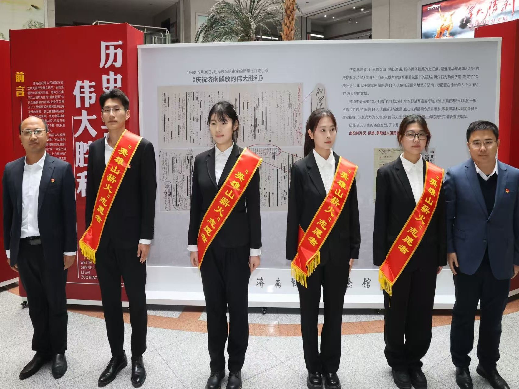 “伟大胜利”济南战役史实展巡展以济南战役为主线,分为“伟大胜利 历史坐标”“八天八夜 鏖战古城”“褒扬英烈 探索创新”等八个部分,再现济南战役的烽火岁月,彰显英雄城市的红色记忆,激发爱党爱国爱社会主义的深厚情感。为确保讲解的专业性与感染力,学院志愿者们在活动前期认真研读济南战役相关史料,深入了解每一件展品、每一幅图片背后的故事,前往济南战役纪念馆接受专业讲解员的现场指导与培训。在讲解过程中,志愿者们以高度的责任心和饱满的热情接待参观团队,通过声情并茂的讲述,将巡展现场打造成一个移动的、沉浸式的“大思政课”实践课堂,将观众带回那个炮火纷飞又充满信仰的年代,让红色展陈“动”起来、革命故事“活”起来,真正实现革命精神可触可感可传承。