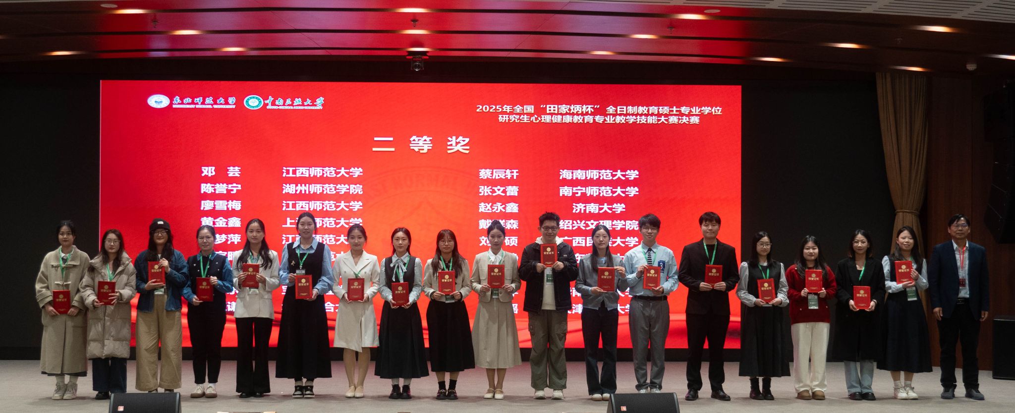 近日,在东北师范大学举行的2025年全国“田家炳杯”全日制教育硕士专业学位研究生“心理健康教育”专业教学技能大赛落下帷幕,魏淑华教授指导的研究生马清泽和董及美副教授指导的研究生赵永鑫获得全国二等奖,乔福强副教授指导的研究生车炳莹和郭迎澳获得全国三等奖,魏淑华老师和董及美老师获得“优秀指导教师奖”。