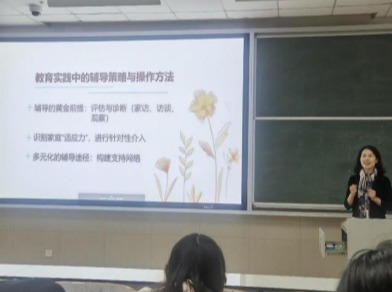 12月3日,焦典(济南特殊教育中心一级教师)老师在11教3502开展《孤独症儿童家庭教育》专题讲座,她用具体数据说明特教学校的转型发展(设孤独症班),并围绕情绪是什么、情绪问题的处理、行为的功能及行为问题干预等主题进行介绍,通过身边真实案例,让特殊教育专业学生认识孤独症儿童问题行为的解决与干预策略,同时体验特殊教育教师的艰辛与坚守,引导他们做事情要尽职尽责。