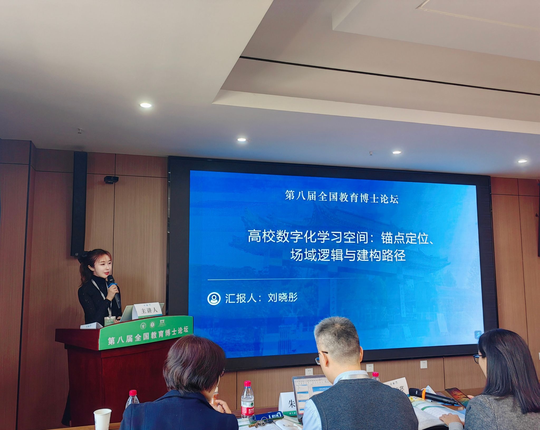 刘晓彤老师受邀参加论坛,并作了“高校数字化学习空间:锚点定位、场域逻辑与建构路径”主题报告。她指出,随着新一代数字技术不断渗透到教育领域,以数字化转型促进人类知识从“原子赋型”向“比特传播”转变、以数字化生存驱动人类学习从“栖居纸本”向“悠游网络”嬗变已经成为时代命题的中心。在此背景上,她积极探索了未来高校数字化学习空间的特质定位与场域形态,为“身体缺场”的大学生找到集体想象的认同场所。这一空间具有分布式跨区域协作、具身沉浸高保真体验、虚实共生数据驱动的学习活动特征,进而演变成数字技术重构物质空间的“分布式发生场”、现实情景融合虚拟空间的“具身式意义场”和虚实共生融入泛在空间的“交互式生活场”。同时,她基于情境创设、超域协同知识建构、反思评价三个学习阶段重构了空间新样态下的数字化探究学习模式,试图为数字技术的学习应用提供具有可操作性的实践范式,为高等教育数字化转型赢得更多时空能动性。