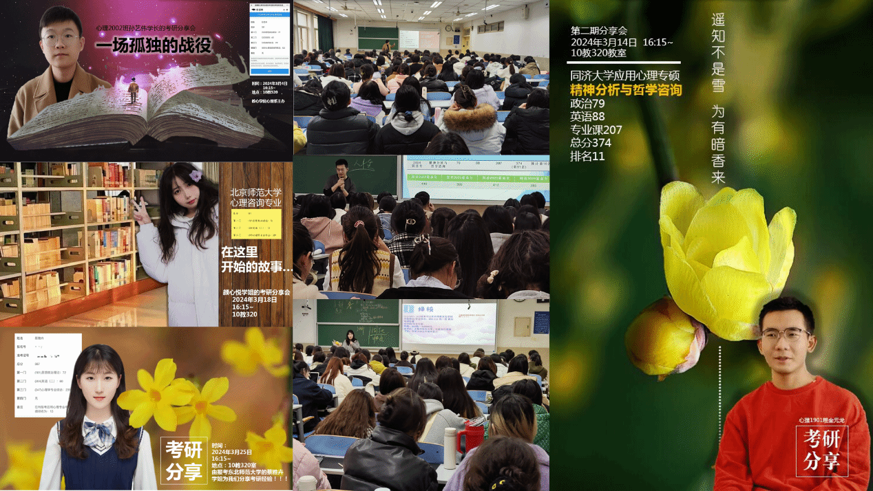本科毕业生考研升学指导工作开展,2024年3月,心理系协同学院学生办公室共同开设了四期专场考研分享会。分享会分别邀请了四位考研成就优异的学长学姐,面向应用心理学专业2021级同学进行了经验分享,激励同学们的考研学习热情,让同学们明确考研目标、坚定考研决心,掌握考研技巧。