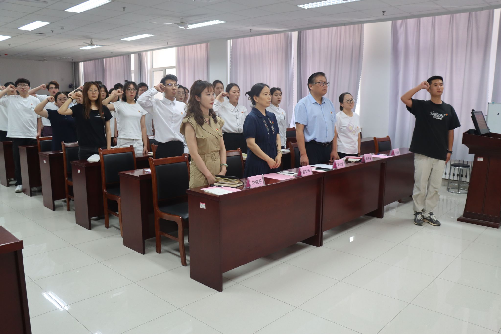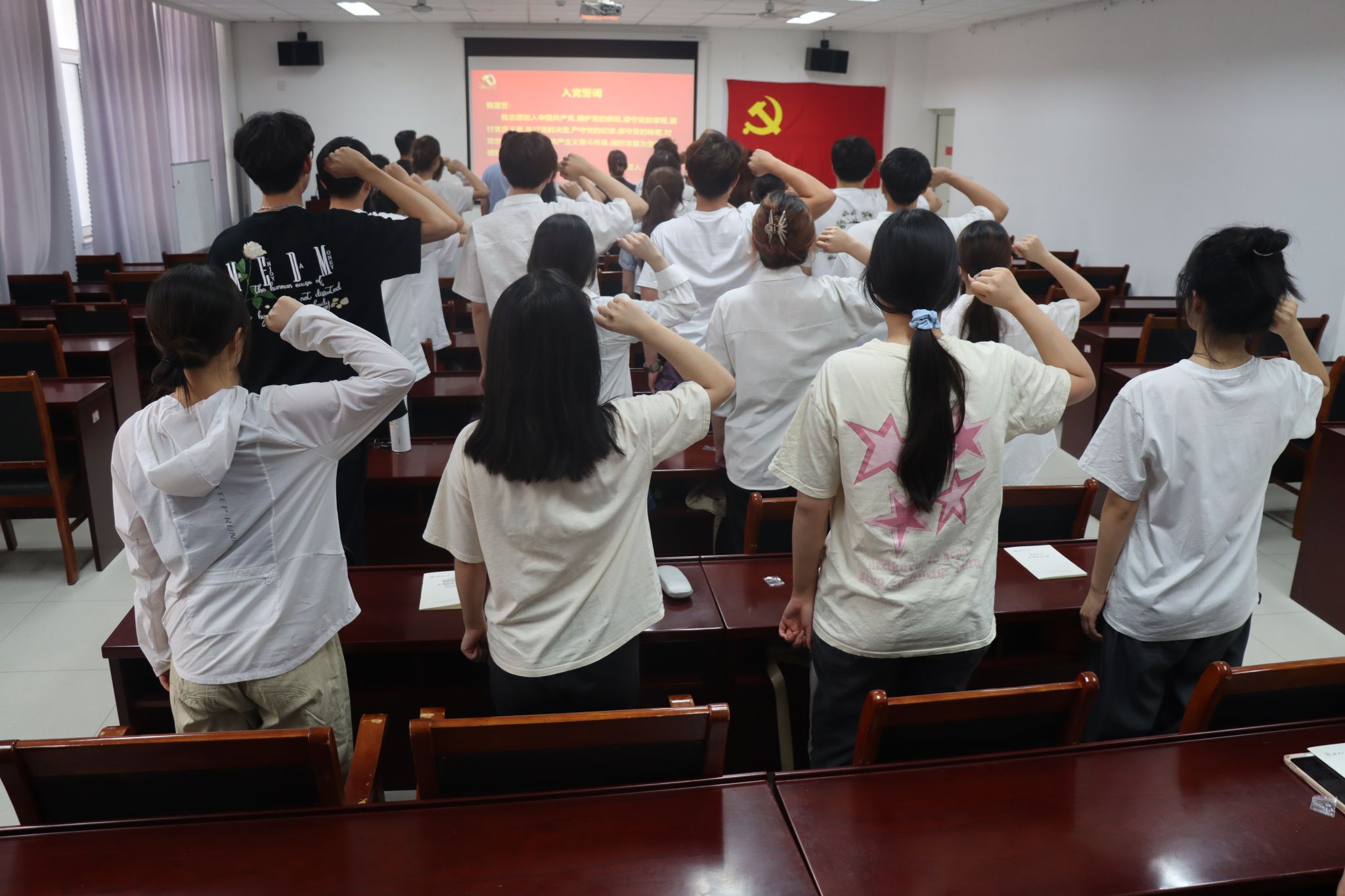 为进一步加强党员教育,强化新党员身份认同感和党组织凝聚力,激发新党员的荣誉感、责任感、使命感,6月27日下午,教心学院党委于特教楼A302举行新发展预备党员入党宣誓仪式。学院党委书记季竹君,组织委员张宝华,学生支部书记卓华丽、刘晓彤,本学期28名新发展预备党员和优秀党员代表参加仪式,学生支部书记曹丽丽主持仪式。