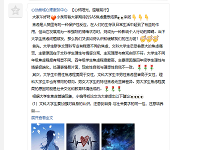学生高度关注自身的心理健康情况,积极参与测试,同时期待着测量结果的推送。经过志愿者们一周的数据收集和精确分析,4月2日上午,心动泉城心理服务中心QQ推送号公布了SAS焦虑量表结果,揭示了当代大学生面临的焦虑问题,分享了焦虑方面的相关专业知识。同时也提出了缓解压力的方法与建议,以帮助当代大学生更好地了解和调节自身心理状态。