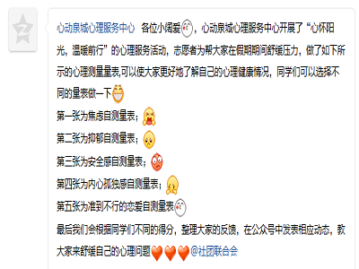 利用学院专业优势,心动泉城心理服务中心志愿者制作出一系列心理测量量表,其中包括焦虑、抑郁、安全感与孤独感等一系列的自测量表,并于3月27日公开收集信息,免费供大学生进行自我测试。欧美无码