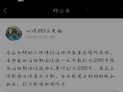 本次步数打卡活动采用微信打卡的形式,要求所有打卡人员需任意一天总步数不少于25000步,并于4月6日12:00前在活动指定QQ群内发送微信运动步数打卡截图。在本次活动中,教心学子在完成步数打卡过程中坚持不懈,发扬"顽强拼博”的精神,追求"更快、更高、更强”的理念,以良好的身体素质和精神面貌全身心投入到工作、学习和生活中去,极大地宣传了体育强身精神,吸引了越来越多的同学参与体育运动,增强身体素质。